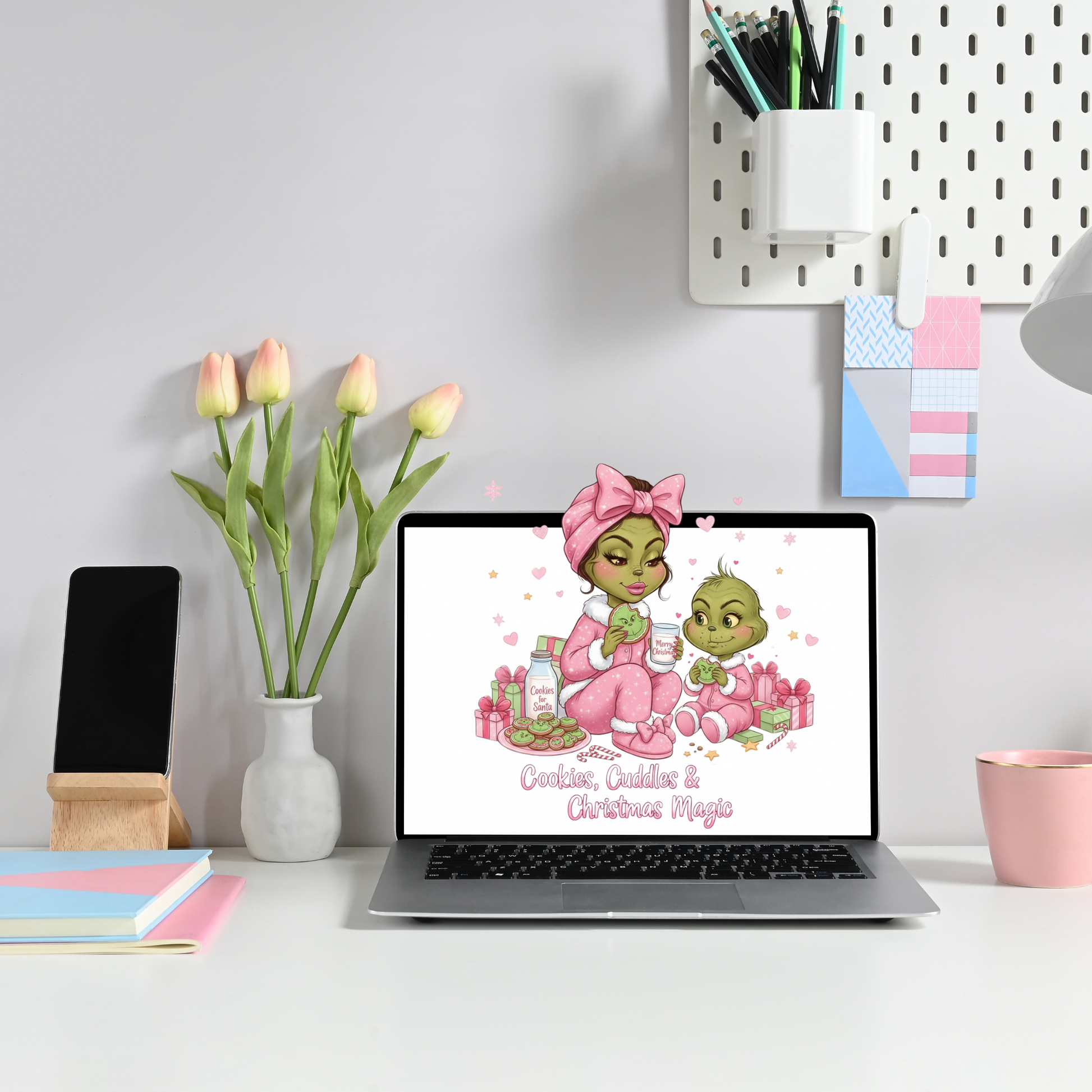 Cookies, Cuddles & Christmas Magic Grinch Mom and Baby PNG | Matching Christmas Pajamas | Holiday Family Clipart | Cute Green Characters Christmas Art